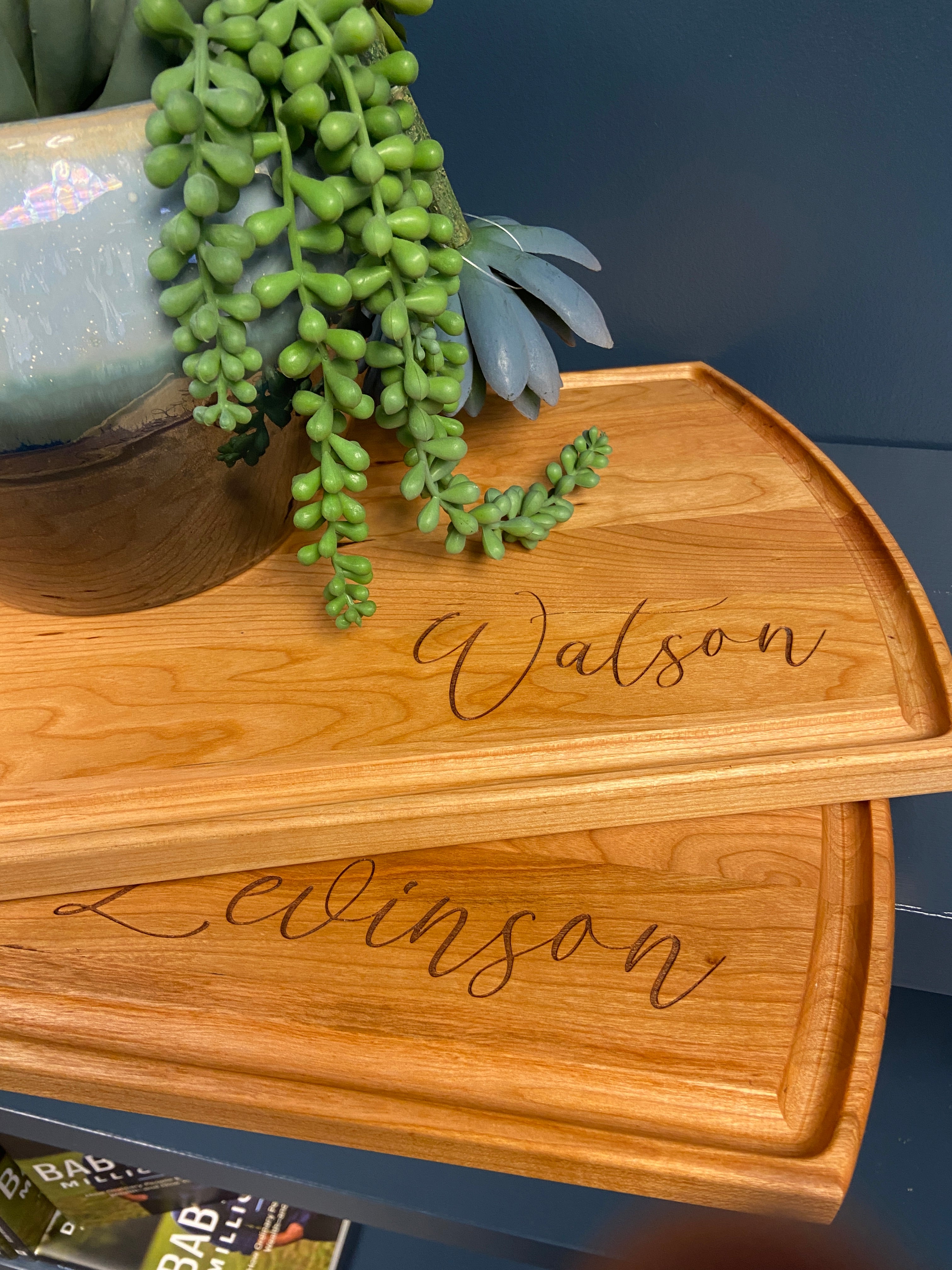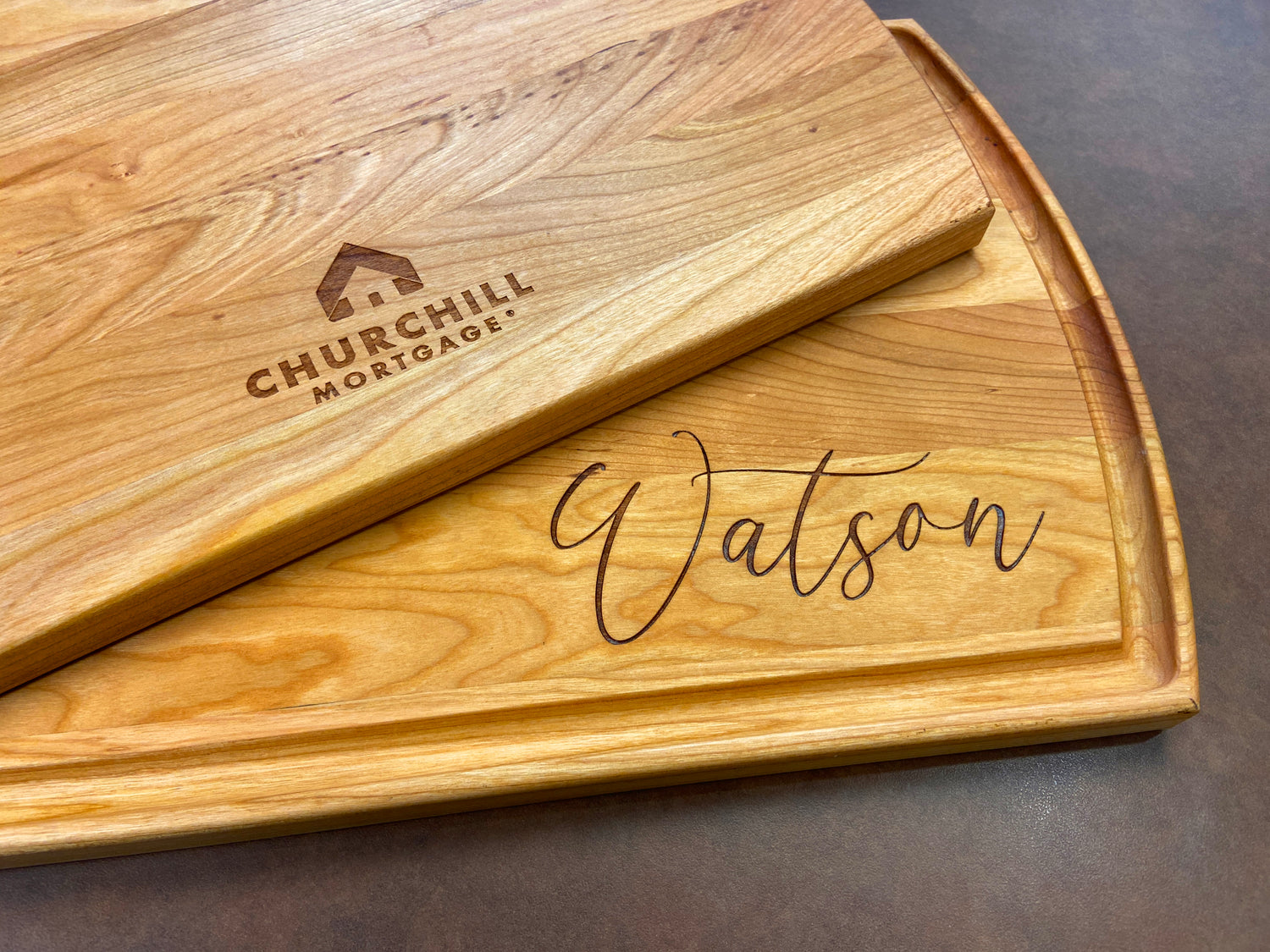 Order a unique serving tray and cutting board for your clients and partners! Crafted from fine cherry hardwood, and professionally laser engraved right here in the USA.